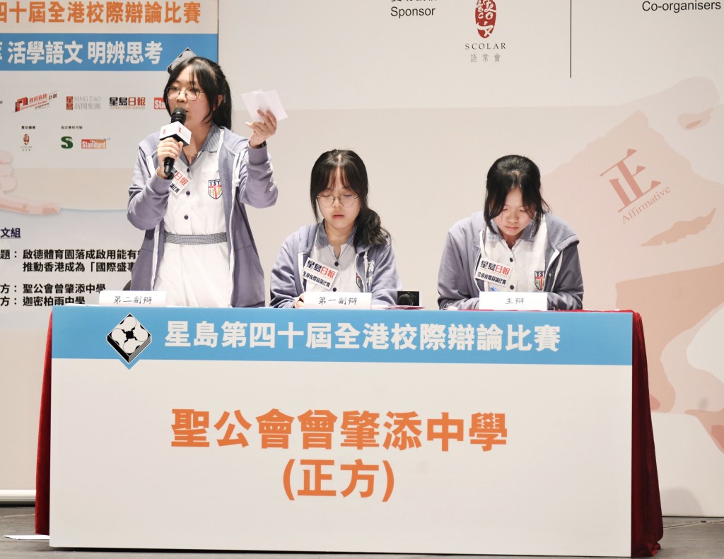 年度学界盛事星岛全港校际辩论比赛踏入第40届,近日完成总决赛,中文组赛事辩题为“启德体育园落成启用能有效推动香港成为‘国际盛事之都’”,由首次跻身总决赛的圣公会曾肇添中学担任正方,与反方迦密柏雨中学对垒,双方就场地条件、观众体验等展开激辩。最终,反方主辩谭靖彤凭借自身观赏美国歌手Taylor Swift演唱会作例子,指出政府态度与周边配套属吸引国际巨星及盛事选择落户的要素,成功力压正方,相隔18年再度勇夺冠军宝座,谭靖彤亦获颁“最佳辩论员”。