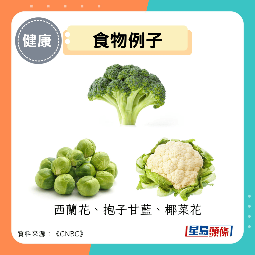 建议选择西兰花、抱子甘蓝、椰菜花、椰菜、芝麻菜和芥兰等。这类蔬菜能促进后生元生成,即是细菌发酵的副产物,有助调节免疫系统,也有利于优化粒线体功能,协助将食物分子中的能量转化为细胞可利用的能量形式。此外,这类蔬菜富含的硫化合物,能透过增加后生元硫化氢来维护血管健康。建议先切碎再烹调,以激活其中的黑芥子酶,这种酵素能大幅提升其抗癌功效。