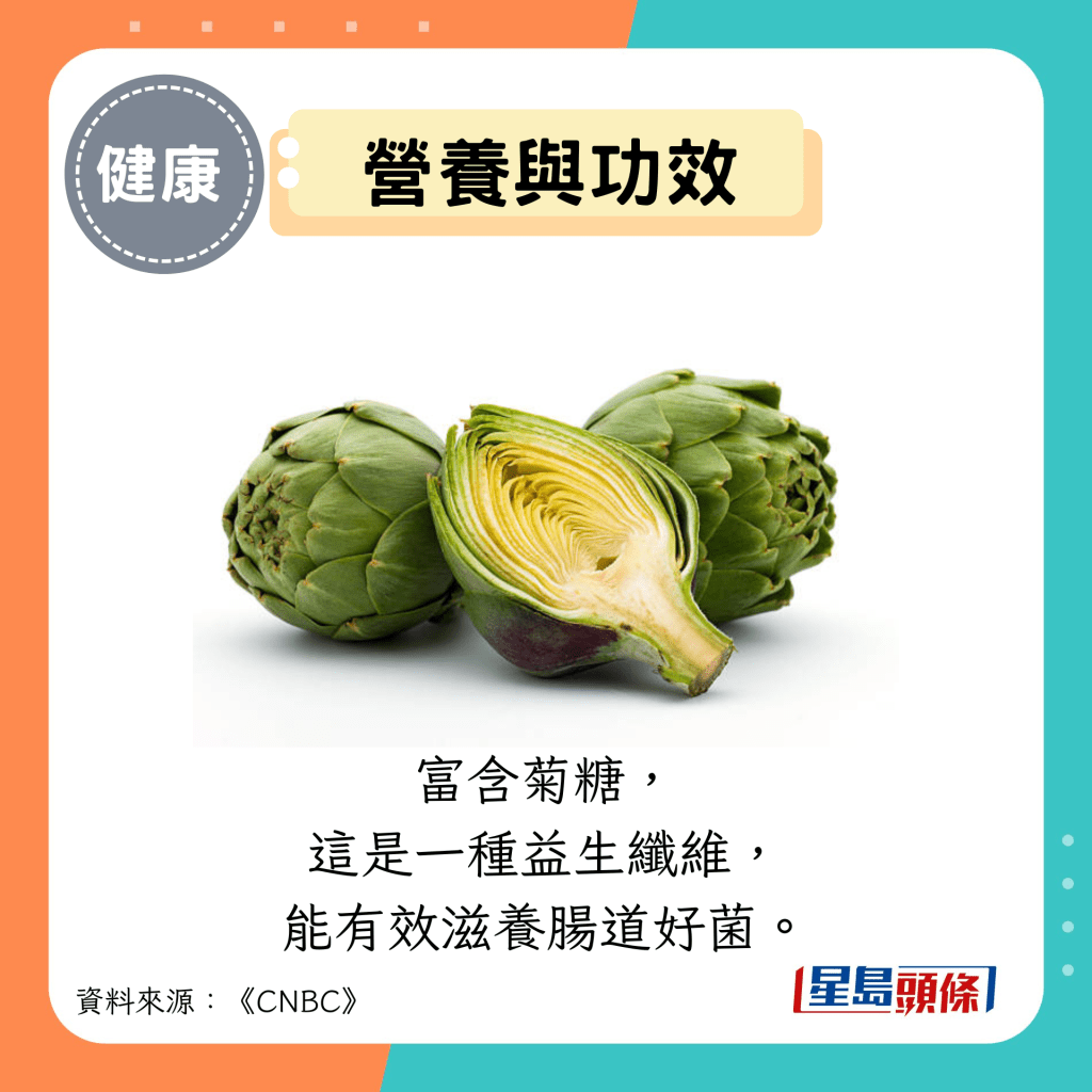 洋蓟为地中海饮食的主要食物,富含菊糖,这是一种益生纤维,能有效滋养肠道好菌。除了低卡路里、低脂肪的特性外,更含有丰富的钾、维他命C、镁和叶酸。建议不要丢弃菜梗,只需剥去粗糙外皮即可食用,还推荐清蒸、快炒或生吃的三种吃法。