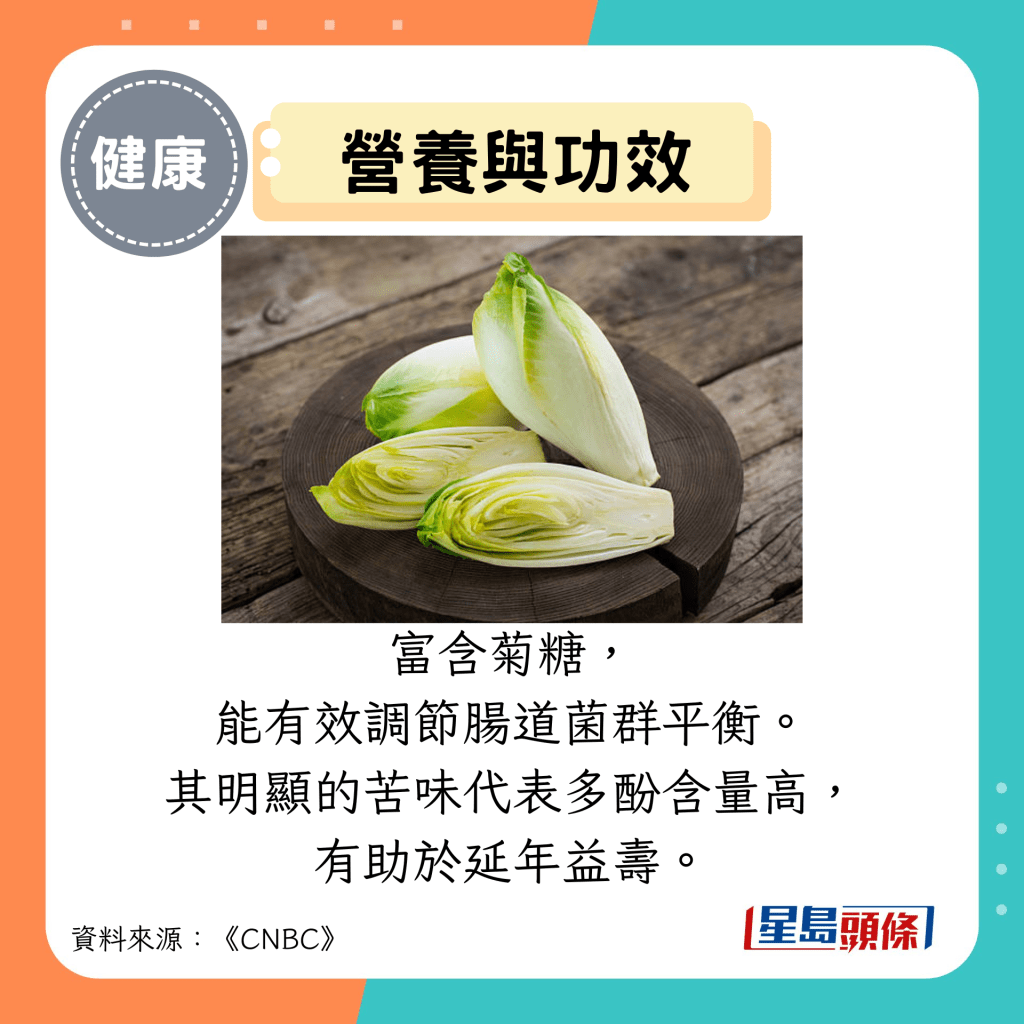 这种蔬菜富含菊糖,能有效调节肠道菌群平衡。其明显的苦味代表多酚含量高,有助于延年益寿。特别是红菊苣,是抗氧化剂的绝佳来源,能保护身体免受自由基的伤害。建议生吃菊苣,也可以与牛油果酱一起食用。