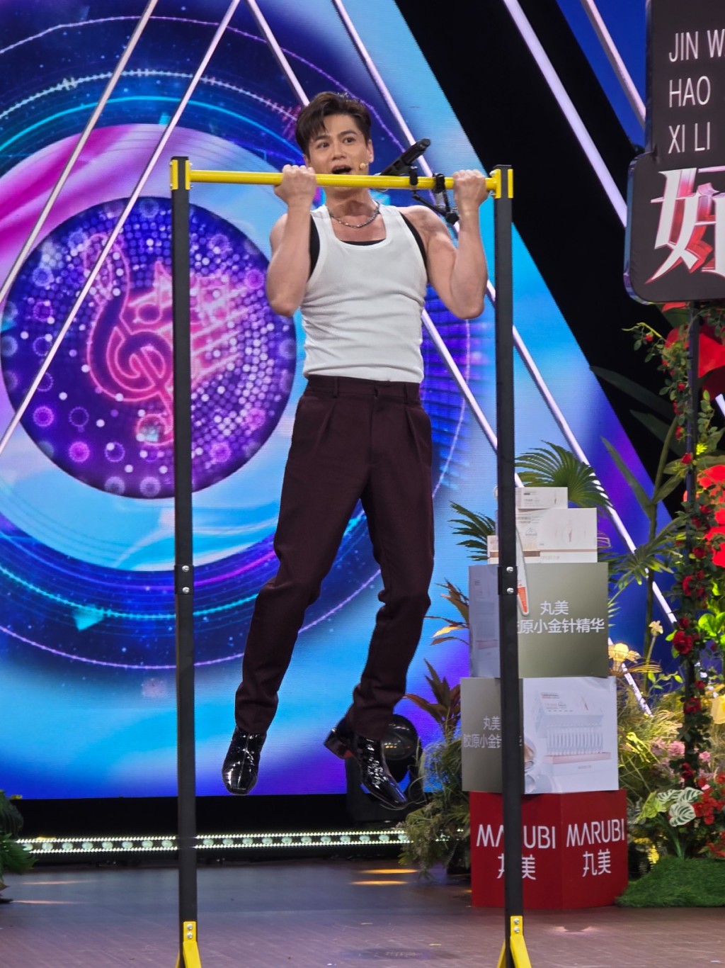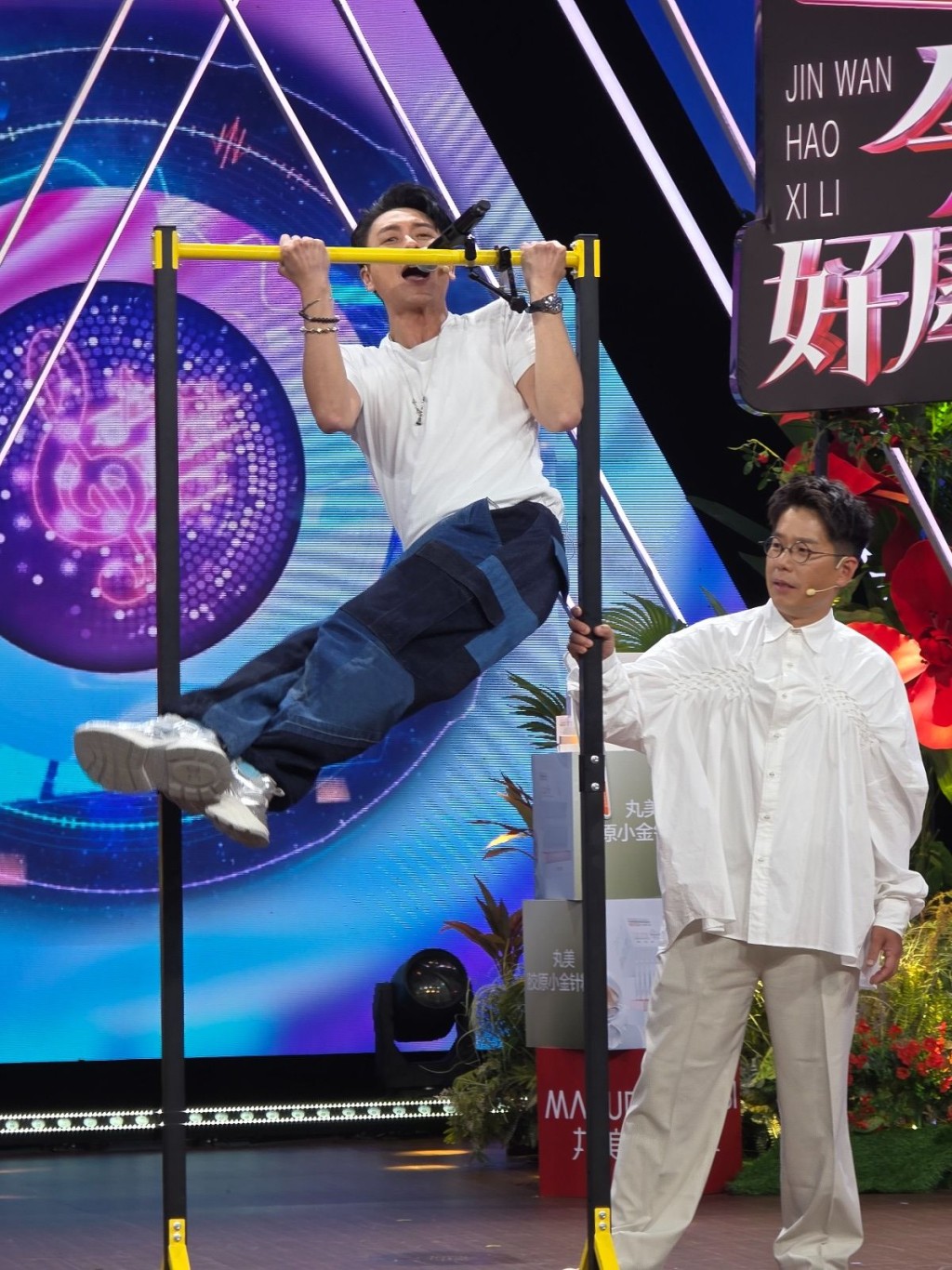 之后再考验男演员体力,要他们一边做运动一边唱歌,玩开运动的Bosco表现得好轻松,在引体上升时还可以双脚向左右摆动,唱歌无索气。而罗子溢索性除了外套以背心上阵,大秀肌肉,令在场女士尖叫不断,而马明做掌上压又唱歌,竟然亦难不到他。