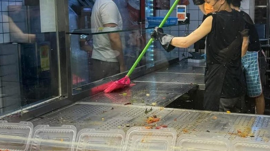 日前,有网民在社交平台Facebook上发布了一则帖文,表示拍摄到某两餸饭店内,有店员手持一把红色“扫把”,并举起“扫把”放到平日放置餸兜的食物柜上,将残余食物扫走,疑似为收铺进行清洁,而一旁盛载着的剩餸胶兜,则被直接放置于两餸饭门外,未作任何遮掩。