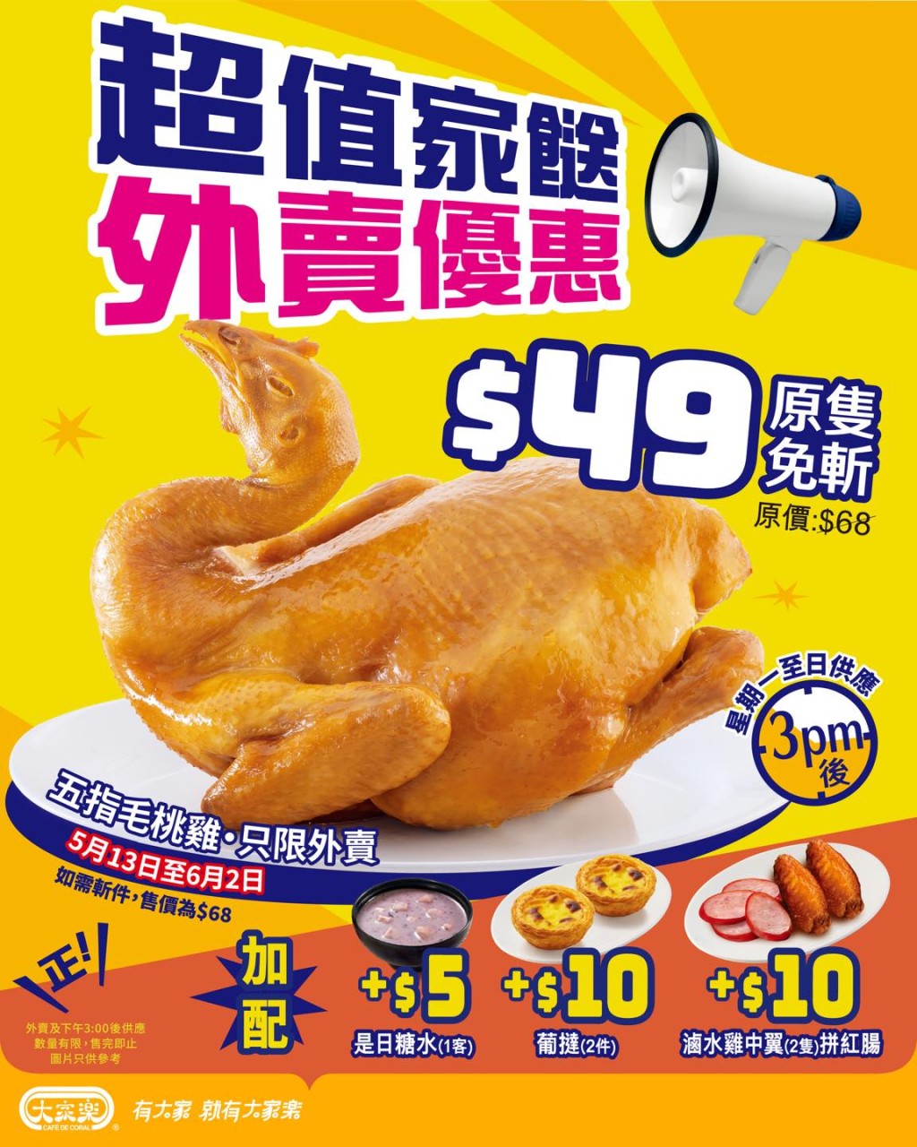 连锁快餐品牌大家乐于即日起至6月2日推出两项全新优惠,涵盖外卖及堂食选项,包括原只的“五指毛桃鸡”及“麦芦卡金蜜烤鸡2人餐”,并提供搭配多元化的加餸选项,满足不同口味需求,低至$49便可以享用这些美味菜式,即睇优惠详情!