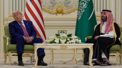 ▲沙特阿拉伯王储萨勒曼13日在雅利德王宫,欢迎到访的美国总统特朗普。(资料照/美联社)