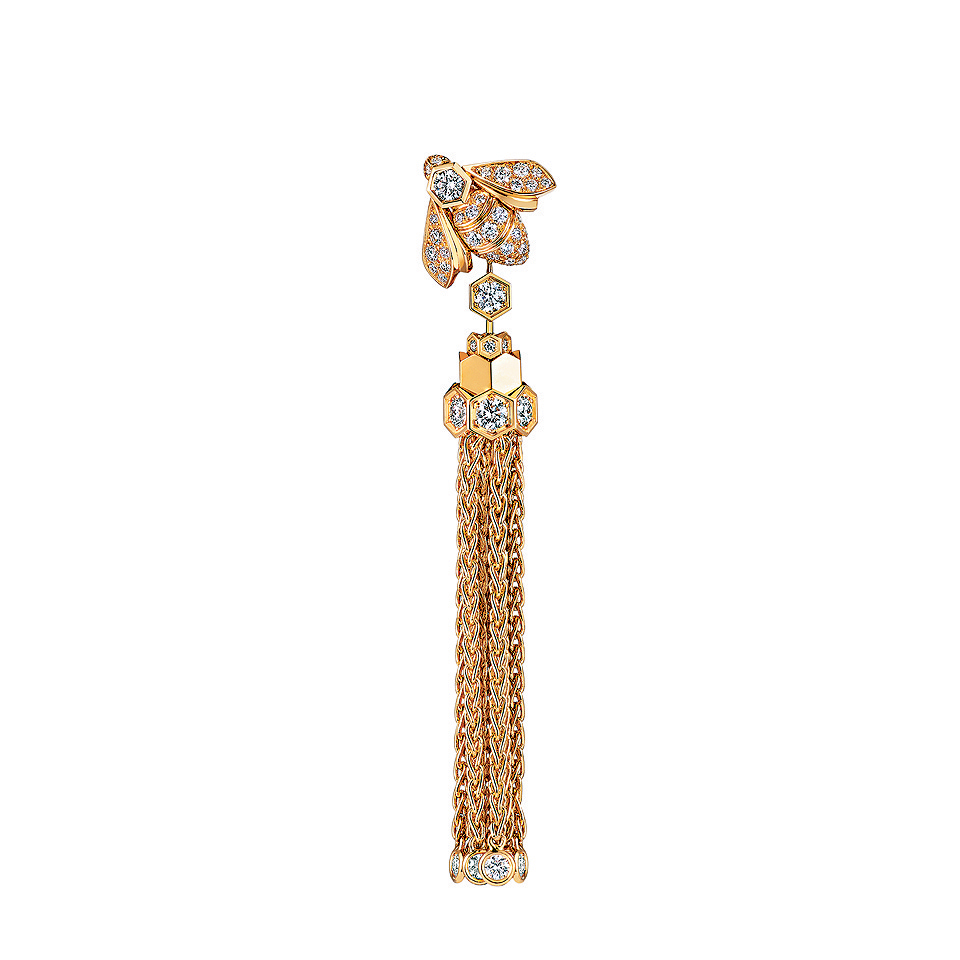 品牌擅用体积大小、黄金工艺及鲜明的图案配搭,捕捉蜜蜂展翅欲飞的瞬间动态,并将之呈现在珠宝作品上。其中铺镶钻石的蜜蜂造型优雅地依附在一款全新的长项链上,配以精致的黄金流穗,带点古典韵味,最适合配衬同系列全新蜜蜂流穗耳环,多条细致柔软的金链在举手投足间轻轻摆动,倍添灵动感。系列中另一枚采用灵活的开口设计手镯则受“Toi et Moi”双主石设计的启发,开口两端分别饰以铺镶钻石及镜面抛光黄金蜜蜂造型,尽展多元形态与魅力。