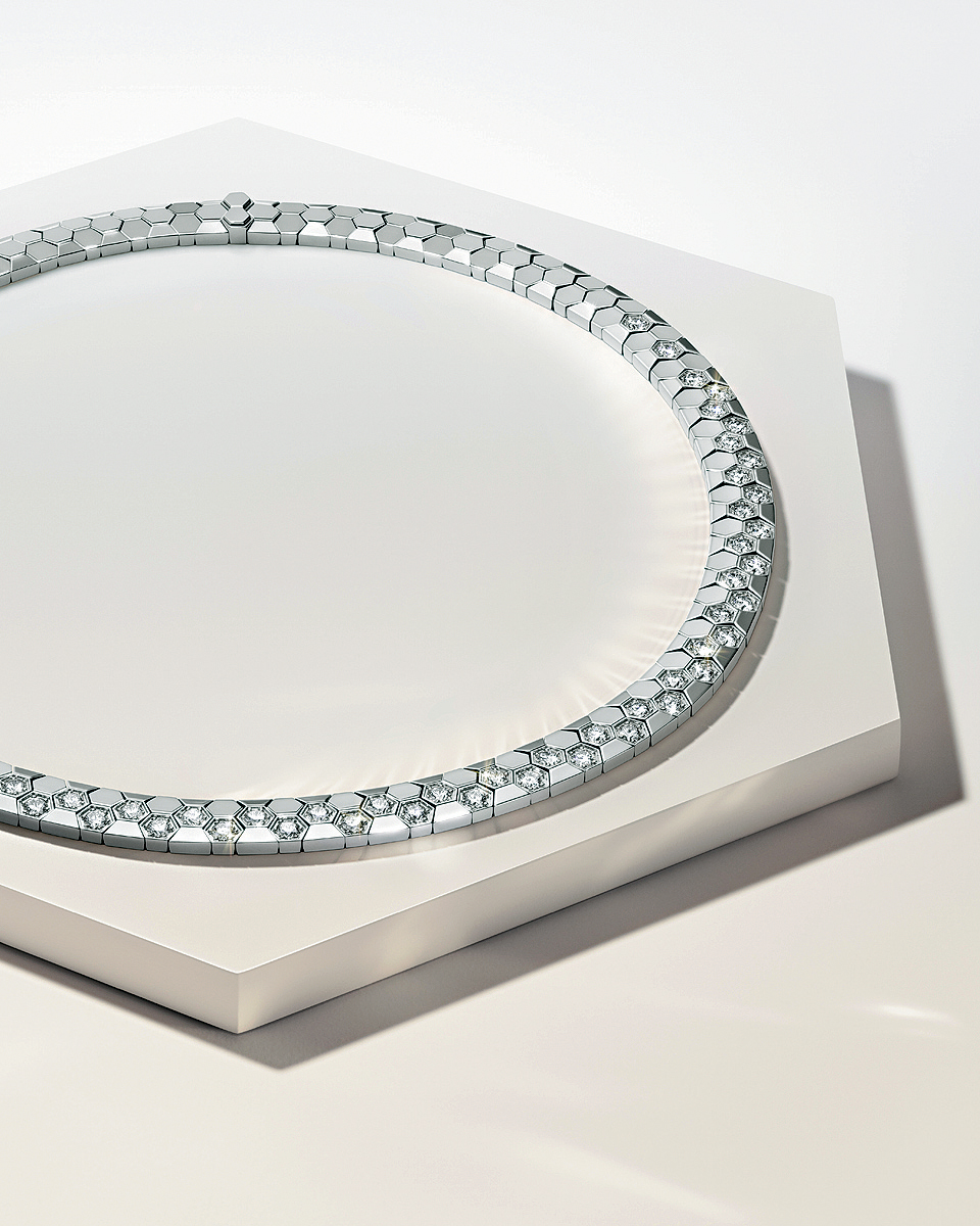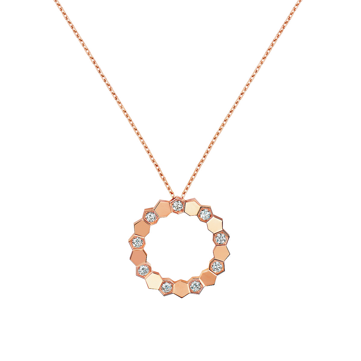 ▲由六角形蜂巢排列的玫瑰金吊坠(中型号)项链,镶嵌明亮式切割钻石。