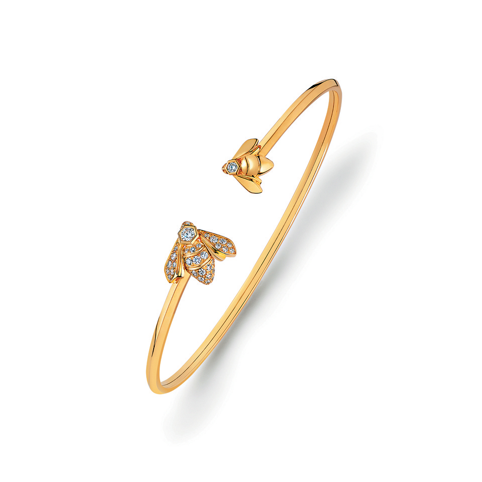 ▲采用灵活的开口设计的手镯,开口两端分别饰以铺镶钻石及镜面抛光黄金打造的蜜蜂造型。