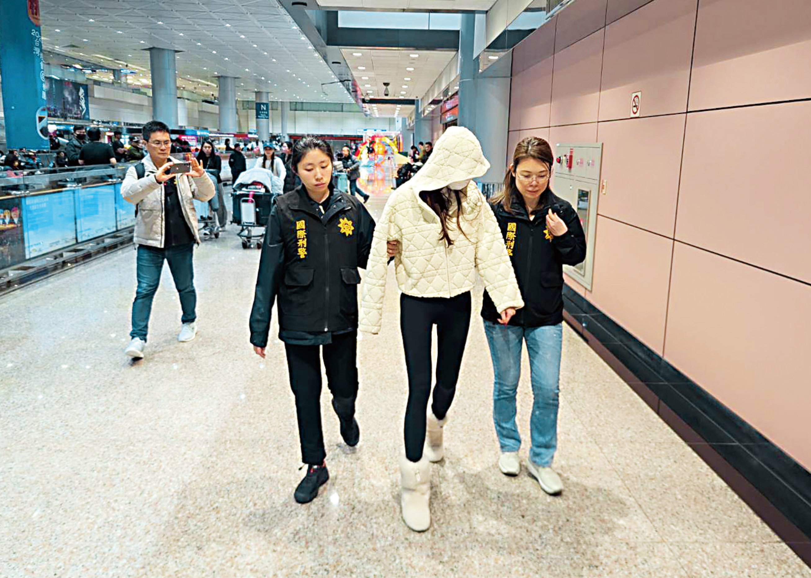▲美国与台湾联手破获跨境诈欺洗钱集团,落网的诈团高级成员36岁廖姓女子(右2)多次整形,今年初在桃园机场被捕。 中央社