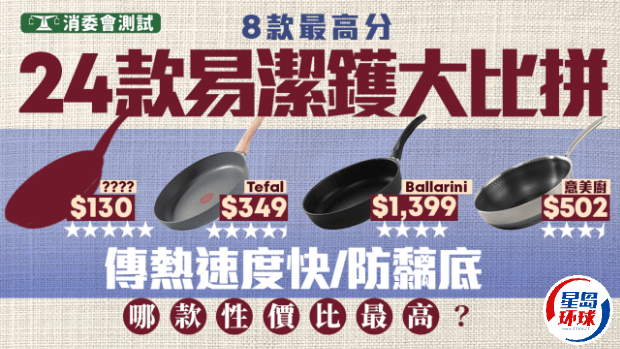 不少人在家中煮食都会用到易洁锅,消费者委员会(消委会)今日(5月15日)发表易洁锅检测结果,消委会测试市面24款易洁锅样本,包括IKEA、Tefal、Ballarini、意美厨等品牌的易洁锅产品。结果消委会发现,样本间的传热速度参差,传热速度最慢的易洁锅样本甚至需时接近16分钟。不过,亦有8款易洁锅样本总评获5星,售价由$130至$1,750不等,反映无论平贵都有好选择,到底哪款仅售$130的易洁锅,仍获消委会5星好评?