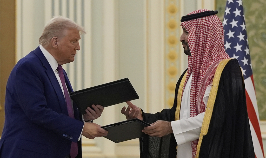 ▲美国总统特朗普13日在利雅得王宫的签约仪式中,和沙特阿拉伯王储沙尔曼(Mohammed Bin Salman)交换文件。美联社