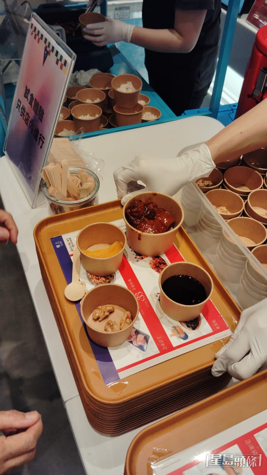 ▲从现场图片可见,试食活动份量十足,每份包括一大片芒果干、半碗桑葚桂圆茶、数粒草莓核桃,还有两只猪手,相当大方。