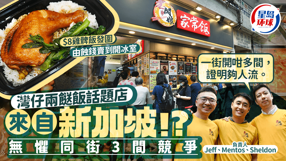 湾仔轩尼诗道近年成为两餸饭战场,一街4间拳来拳往大打价格战! 其中尤以“老板娘家常饭”曝光率最高,由创两餸饭放题先河,再用股灾价$8鸡髀饭吸客,开业短短一年即跃身成为话题食店! 不说不知,该店母公司竟是新加坡品牌,过江龙大战地头虫,能毫不落下风,今次《星岛头条》就找来三位负责人黄嘉威(Jeff)、龙家明(Mentos)及谢燕心(Sheldon)访问,一探究竟。