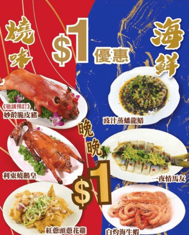 香港食肆结业潮不断,不少品牌都要推出低价优惠自救。香港连锁酒楼利东集团就推出重磅优惠,以“$1极品乳猪”及多款海鲜为主打,吸引饕客目光。这次活动不仅包含多款顶级烧味和海鲜,还特别推出针对长者的$2茗茶优惠,堪称超值之选。