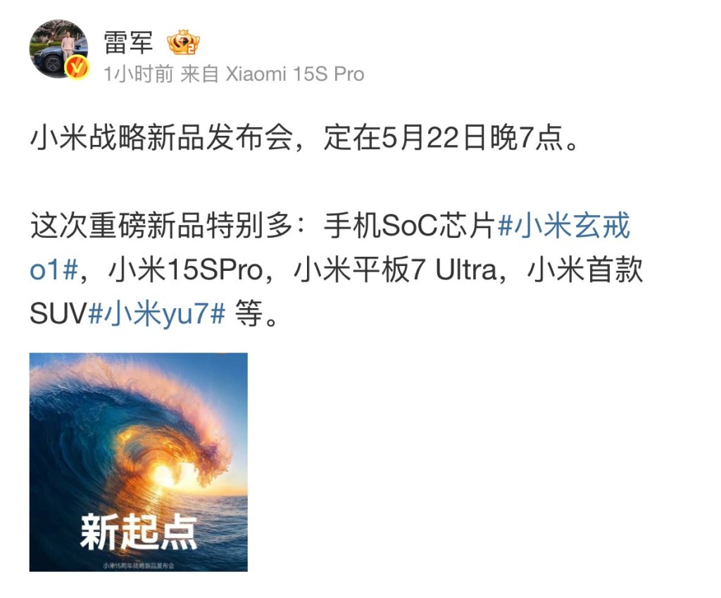 小米(1810)行政总裁雷军今日(19日)于微博宣布,将于5月22日(周四)晚上7点举行“小米战略新品发布会”。他在贴文中透露,此次发布会将推出多款焦点新品,包括小米自研手机Soc芯片“小米玄戒o1”、小米15S Pro,小米平板7 Ultra,以及小米的首款电动SUV“小米YU7”等。
