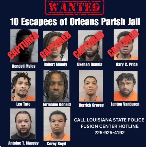 10名囚犯都有重罪在身或面临重罪指控,年龄介于19至42岁。至案发隔天17日,有3名脱逃囚犯被捕,19日第4人落网,其余6人仍在逃,超过200名执法人员加入搜捕行列,每1名在逃囚犯的悬赏奖金已从1万7000美元增加到2万美元,其中1万美元来自美国联邦调查局(FBI),5000美元来自烟酒枪炮及爆裂物管理局(Bureau of Alcohol, Tobacco, Firearms and Explosives)、5000美元由“犯罪终结者”(CrimeStoppers)通报热线提供。 FBI表示,至少1人经由大众检举而落网。