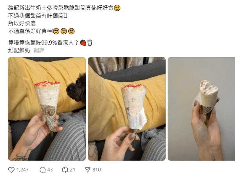 不过,最近就有网民发现这款甜筒竟然出现“隐藏版”?有网民在社交平台Threads发文,指购入该款甜筒后撕开包装纸,惟一直只见雪糕未见甜筒,“维记新出牛奶士多啤梨脆脆甜筒真系好好食,不过我个甜筒冇咗个筒,所以好快溶,不过真系好好食”,笑言“算唔算系赢咗99.9%香港人?”