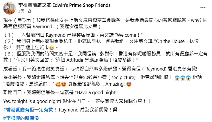 李根兴在帖文中提到,当晚他与家人用餐,甫进门,服务员Raymond便以满脸笑容迎接,并以英文说道:“Welcome!”在用餐过程中,因李根兴一家没有携带足够现金购买纸巾,Raymond立即送上一包,并用英文表示:“On the House,送俾你!”,未有像一般茶餐厅那般额外收费,相当贴心。 李又特别赞扬,在整个用餐过程中,Raymond始终保持笑容,让李根兴直言:“觉得有佢(Raymond),香港真系有救!”
