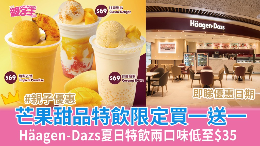 夏天来了,各位芒果控要准备就绪大叹各式各样的芒果美食了。 今日(21日)起,Häagen-Dazs将推出芒果甜品特饮限定买一送一,只需一半价钱,即$34.5就叹到冰爽特饮,还有3种不同口味组合,均以经典芒果拼合各种热带水果。 即睇Häagen-Dazs优惠详情,快快跟小朋友放学后一人一杯喇!