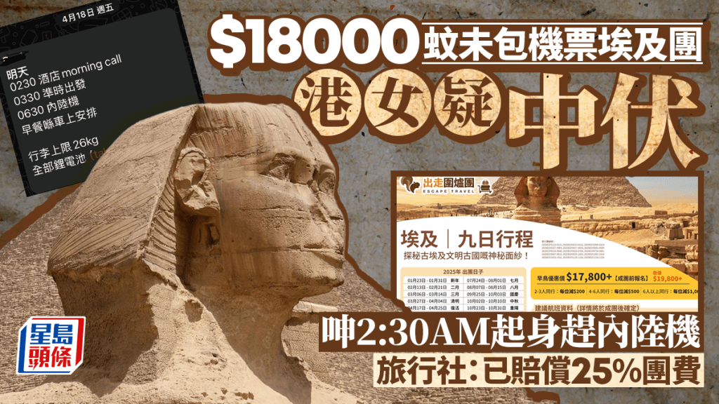 近年旅行社推出的旅行产品五花八门,除“盲盒旅行团”外,亦有旅行社以年轻人为巿场推出“围炉旅行团”,惟有港女在参加该旅行社的埃及团后大呻中伏,在社交平台怒轰旅行团货不对办、严重欺骗消费者、偷换劣质酒店、行程安排极差,直言被卖猪仔。