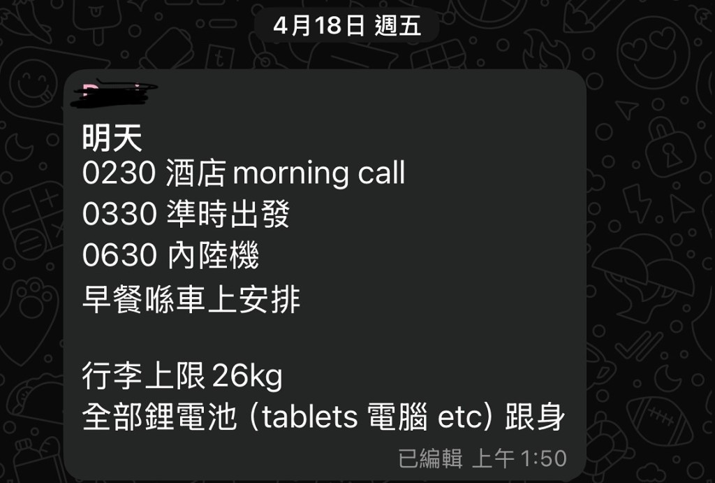 ▲事主称乘搭内陆机当日凌晨2:30 morning call。