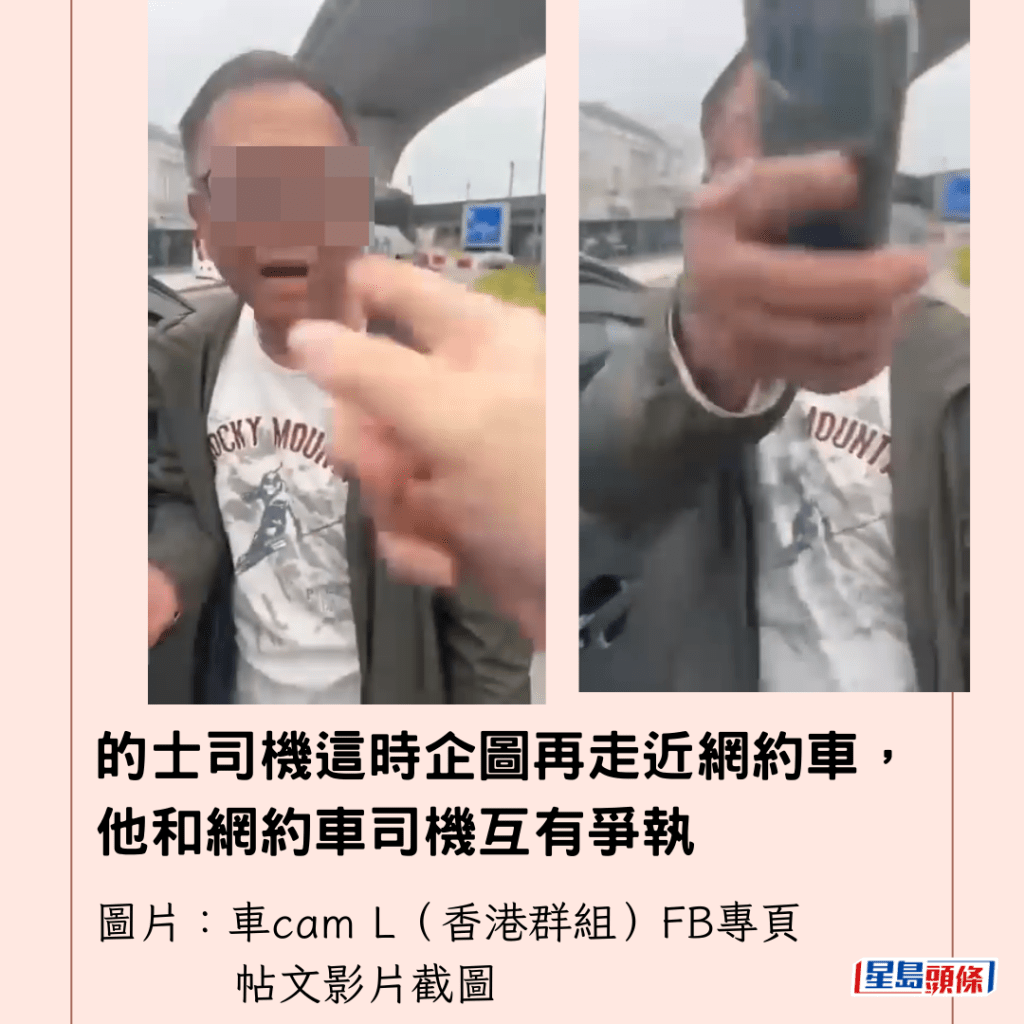 的士司机爆粗骂网约车司机:“你撞到我架车啊,X你老母!”网约车司机质问:“你开我车门仲咩啊?!”的士司机则指网约车车门是“自己开嘅”,这时似有机场职员到来调停,的士司机再拍摄车内游客样貌,并大喊:“哗哗哗,个车门又自己开啦,我X你老母!”