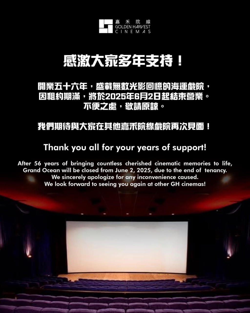 嘉禾院线今日(21日)公布,历经近半个世纪、尖沙咀地标戏院海运戏院租约到期,将于6月2日起正式结束营业,为这个深受影迷喜爱的戏院画下句号。