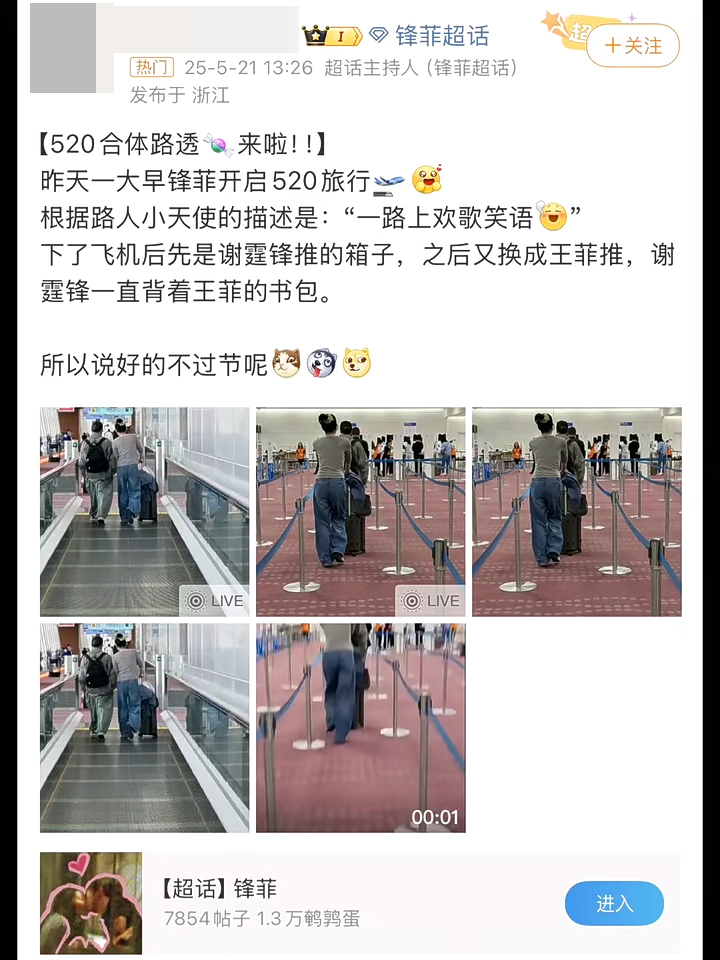 今日(21日)内地社交平台流传,被指是谢霆锋与王菲被捕获的照片,他们的粉丝转发到微博超话,更引述拍到他们的网民表示:“跟据路人小天使的描述是‘一路上欢歌笑语’,下了飞机后先是谢霆锋推的箱子,之后又换成王菲推。”更大爆谢霆锋一直背着王菲的背包,CP粉都大呼:“好甜!”同时又嘲曾表示不爱“过节”庆祝的二人竟选在“520”出游,说:“所以说好的不过节呢?”