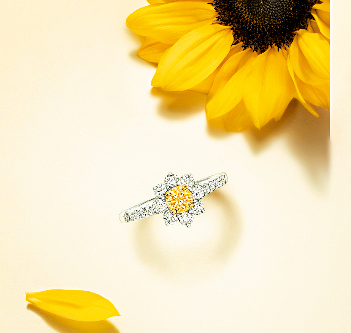 ▲Sunflower系列以黄钻为主石设计的戒指,8颗钻石环绕圆形黄钻主石,重现向日葵的风采。
