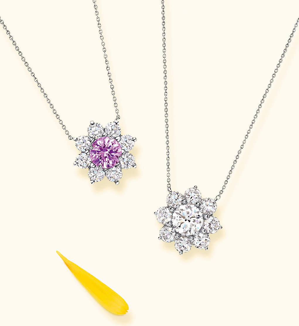 ▲系列中的两款吊坠项链,包括全钻石及中间镶嵌粉红蓝宝石的款式。