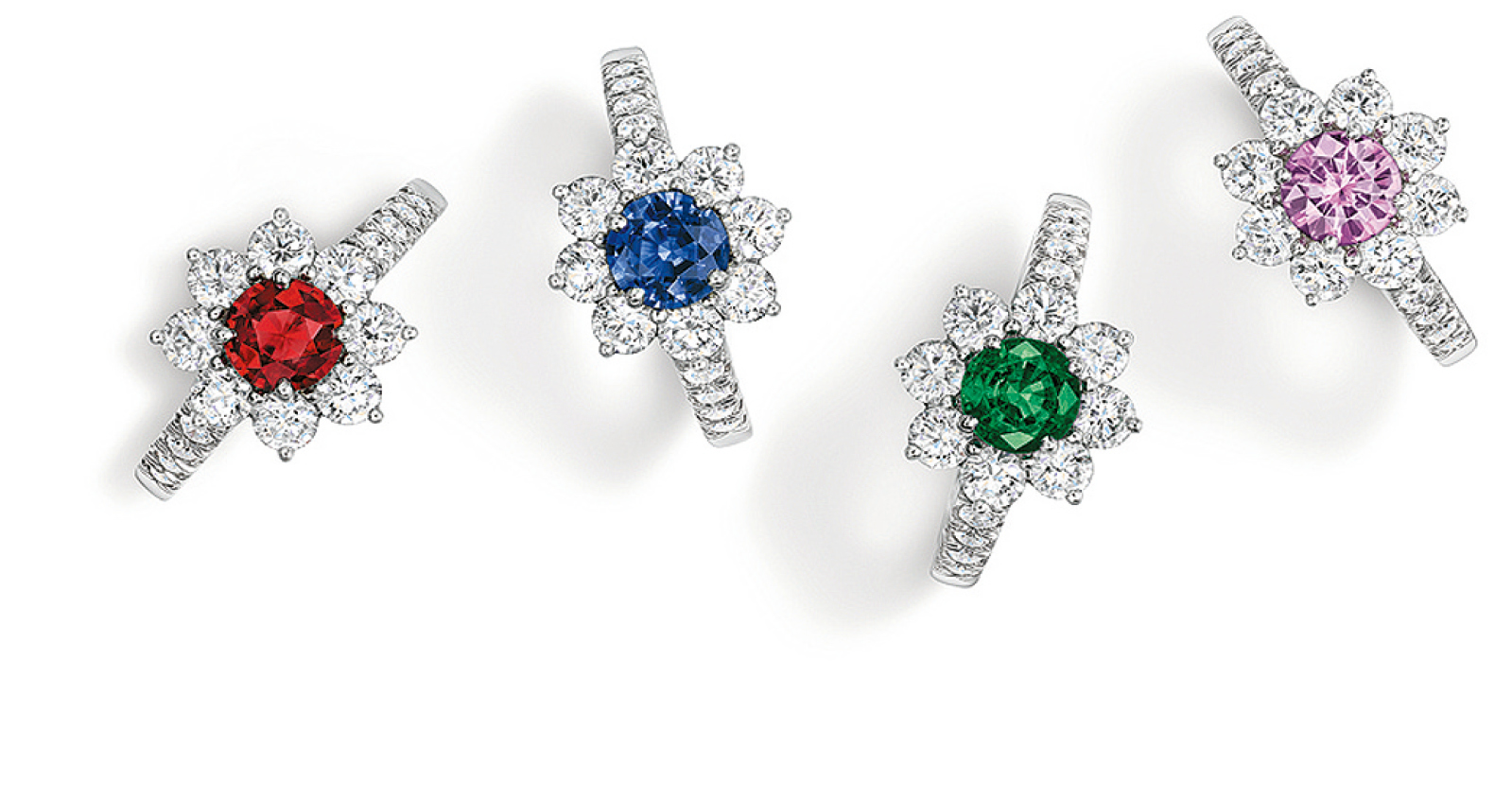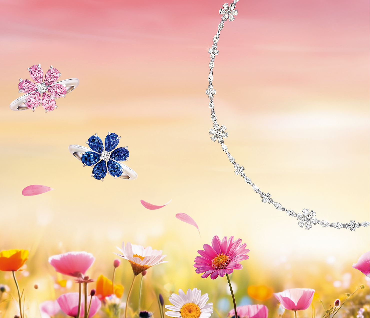 ▲Forget-Me-Not系列钻石项链、粉红刚玉钻石戒指及蓝宝石钻石戒指。