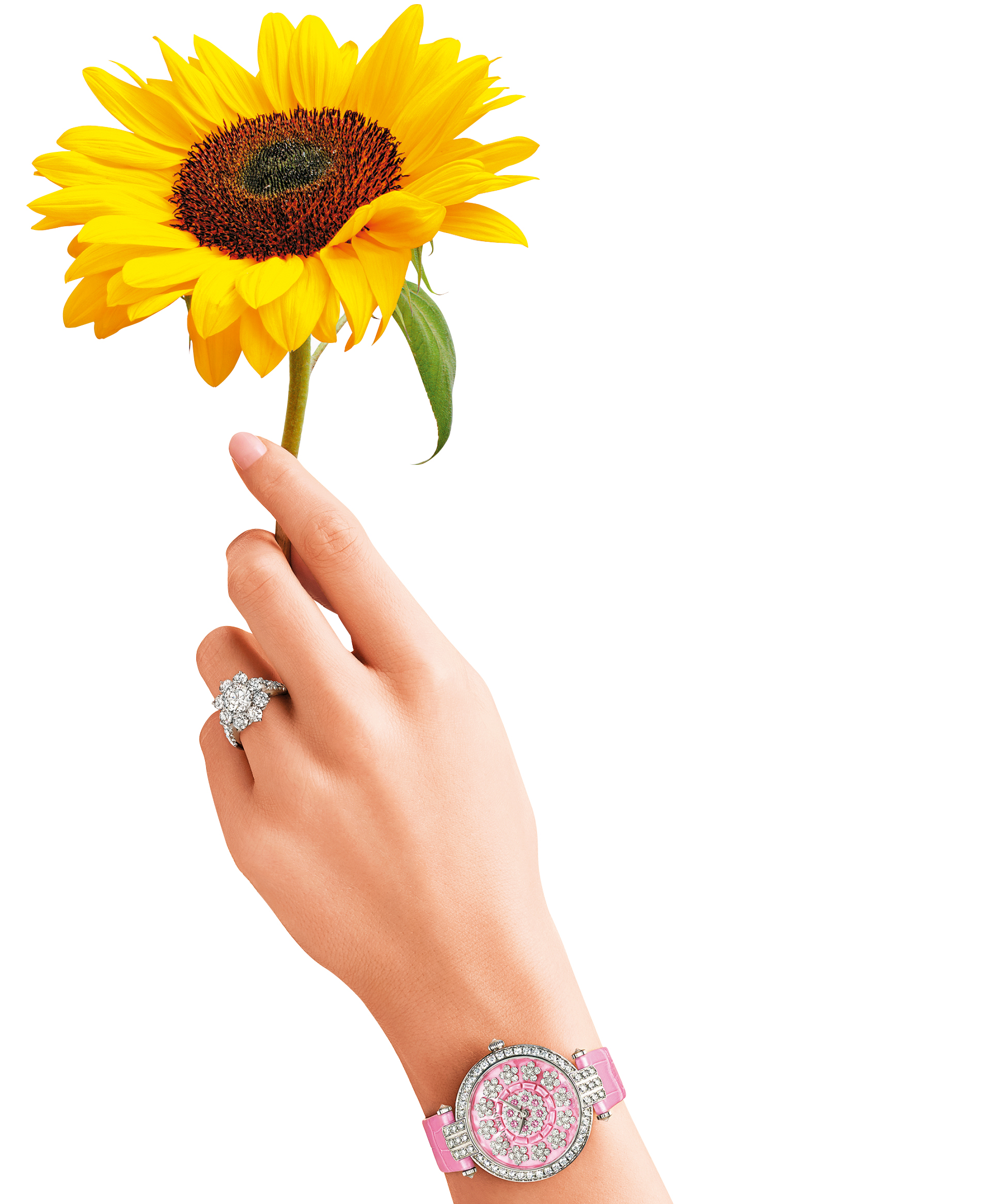 说到此花朵图案在品牌档案库中的历史,可追溯至1950年代中期,最初可见于品牌档案设计稿上,之后经重新诠释轮廓,并于2005年带来经典又别具象征意义的Sunflower系列,当中包罗项链、坠链、耳环、手链及戒指等多元化作品。系列以热情奔放的花朵命名,火焰般的花瓣萦绕着完美的花蕊是设计的灵魂所在。要完美演绎向日葵的神髓,品牌就以8颗尺寸精巧的钻石环绕圆形主石为设计核心,重点呈现花卉赋予的精神奕奕风采与灿烂自信美感,拼凑出来的璀璨立体花形令每颗钻石都绽放灵动的光彩,每件珠宝不论配搭日间或晚间造型,都是钻光四射。