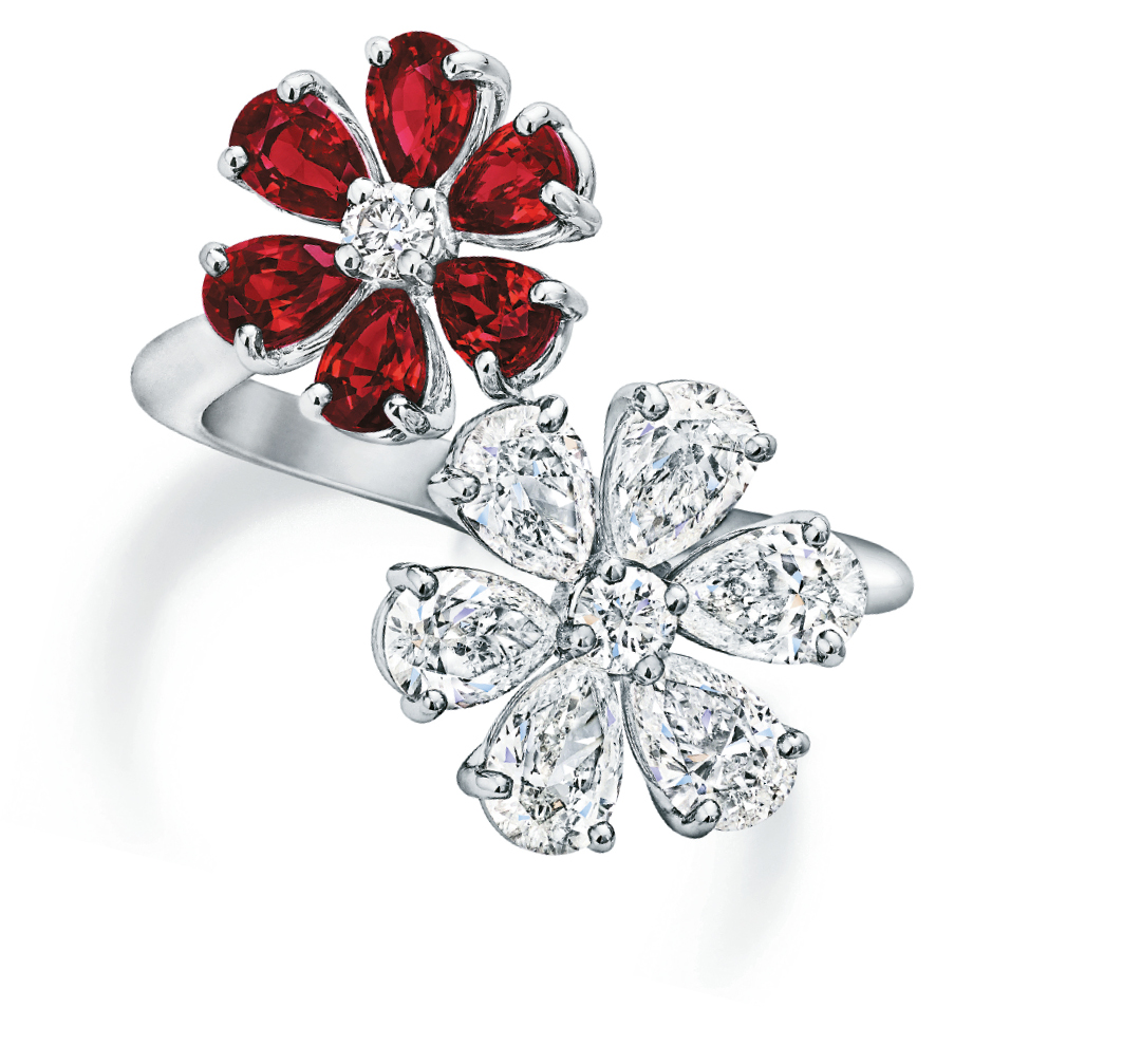▲Forget-Me-Not系列双环戒指,红宝石和钻石镶嵌而成的6瓣花卉造型,带来迷人的对比视效。