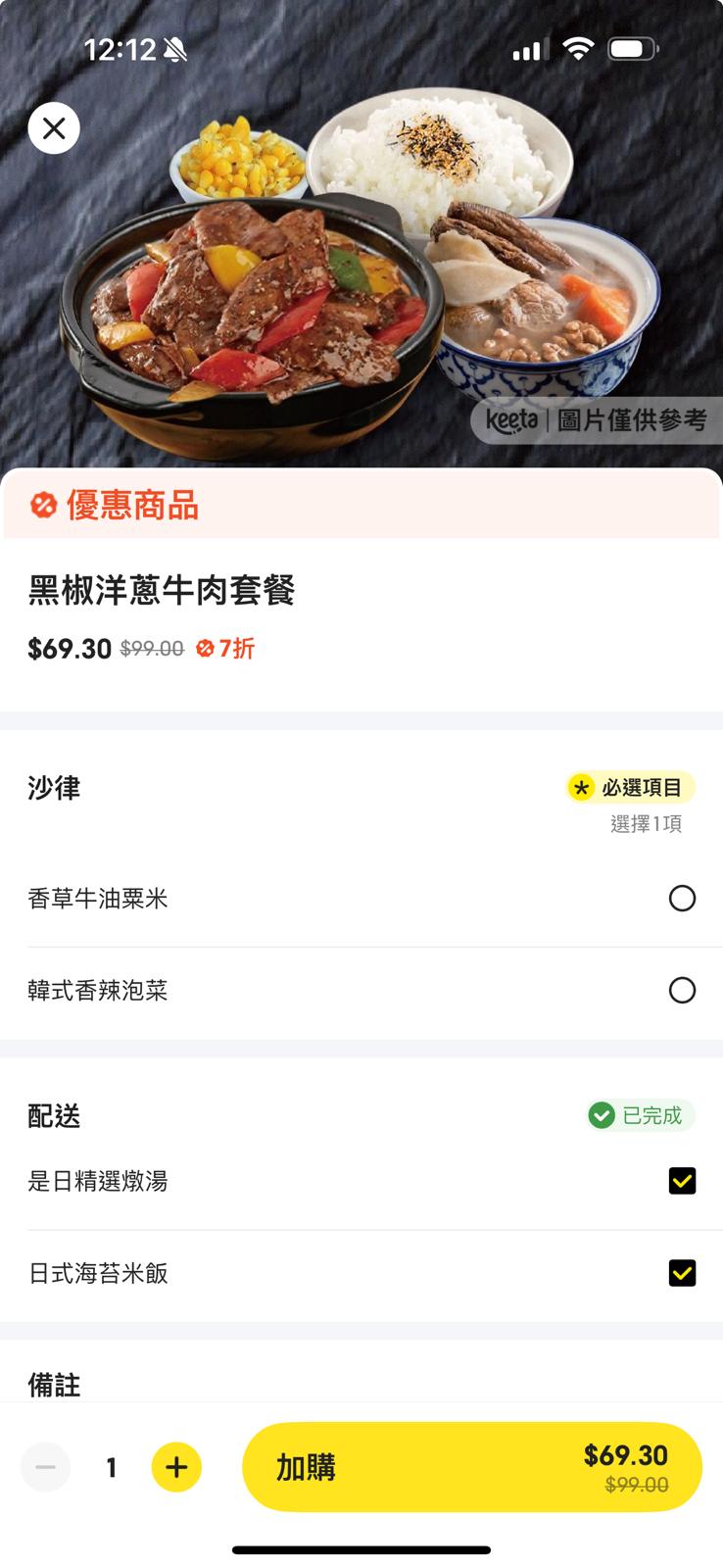 翻查外卖平台资料,餐厅供应的黑椒洋葱牛肉套餐原价$99,平台折扣后为$69.3,包括一份黑椒洋葱牛肉、沙律(可选香草牛油粟米或韩式泡菜),奉送是日炖汤及日式海苔米饭。