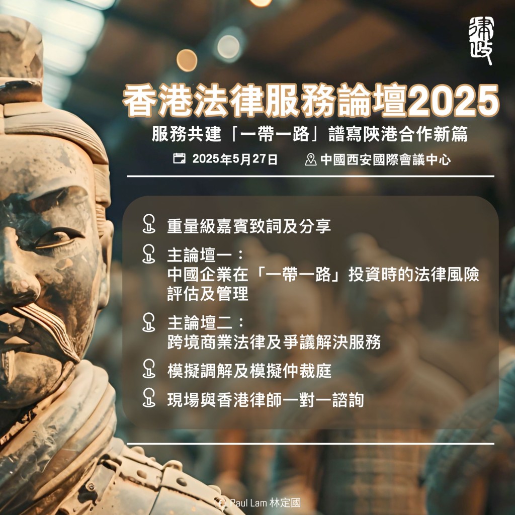 论坛由律政司、陕西省司法厅、陕西省人民政府港澳事务办公室共同主办,并得到香港贸发局及西安市人民政府鼎力支持,将聚焦“一带一路”投资法律风险管理、企业资产保障、跨境融资并购等实务议题,并探讨跨境纠纷解决机制、知识产权保护及科技在争议解决中的创新应用。 现场设有模拟调解仲裁环节及律师一对一咨询,强化实务交流。