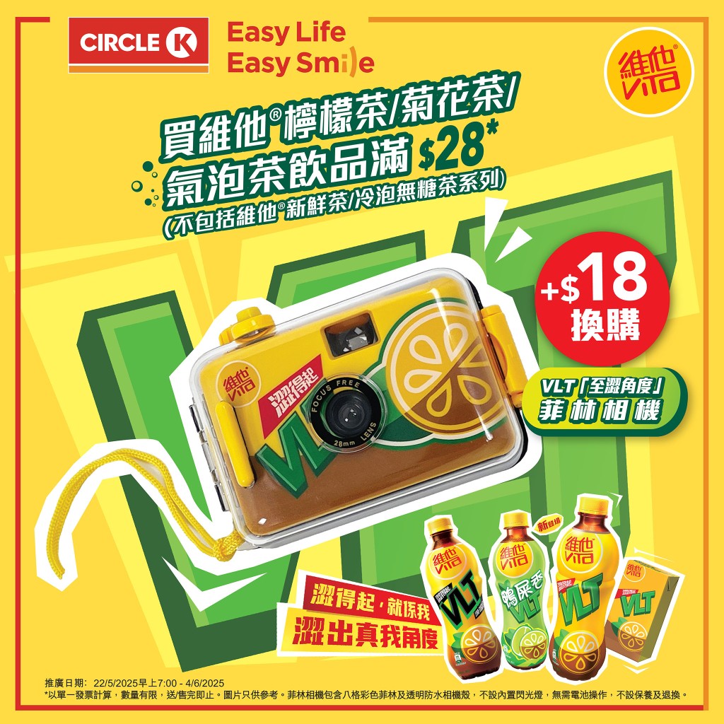 维他柠檬茶近日推出限量换购的VLT“至涩角度”菲林相机,由今日(5月22日)早上7时起至6月4日,顾客只要到指定便利店购买维他柠檬茶、菊花茶或气泡茶饮品满$28,即可加$18换限量别注版VLT菲林相机,附送彩色菲林及透明防水相机壳。