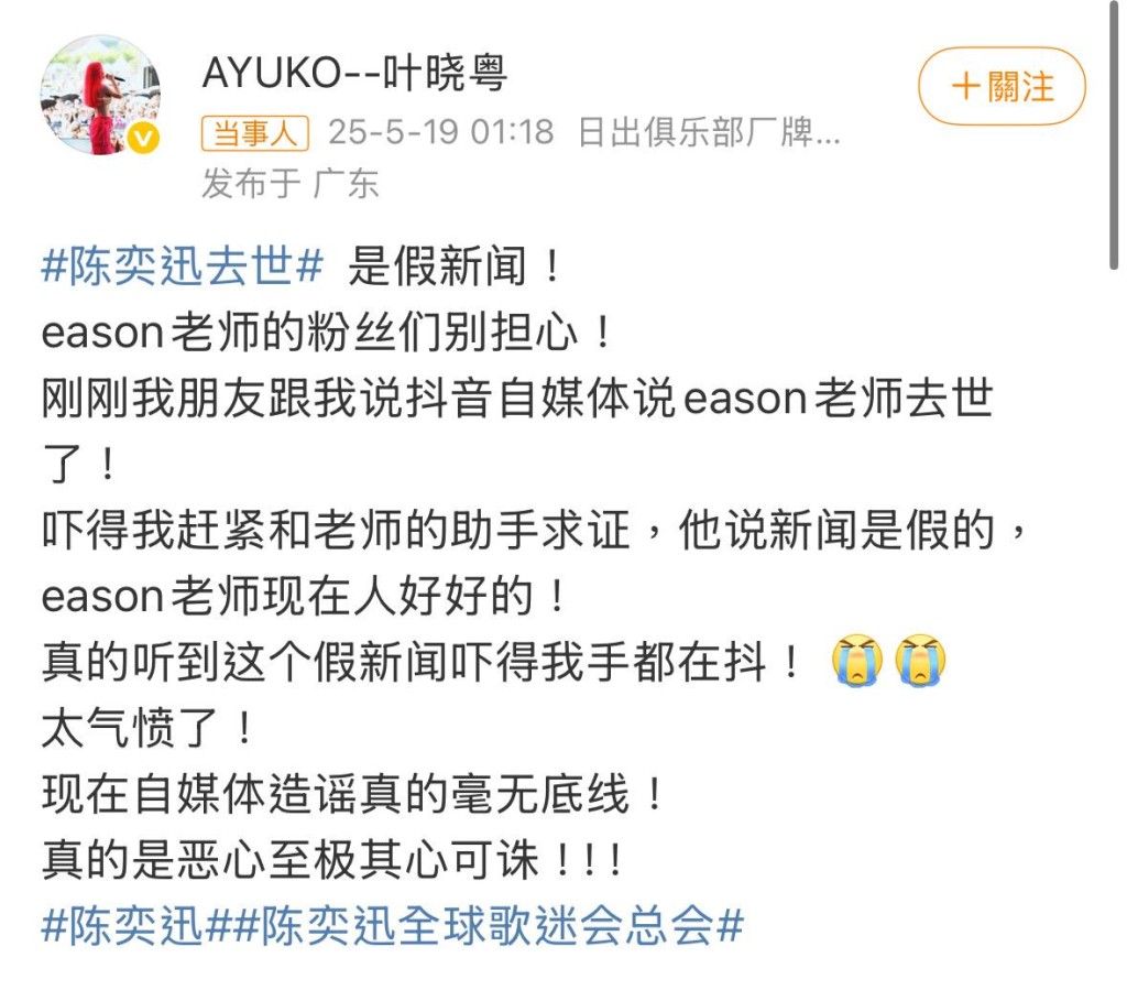 ▲叶晓粤怒斥“陈奕迅过世”假消息。(TVBS新闻网图片)