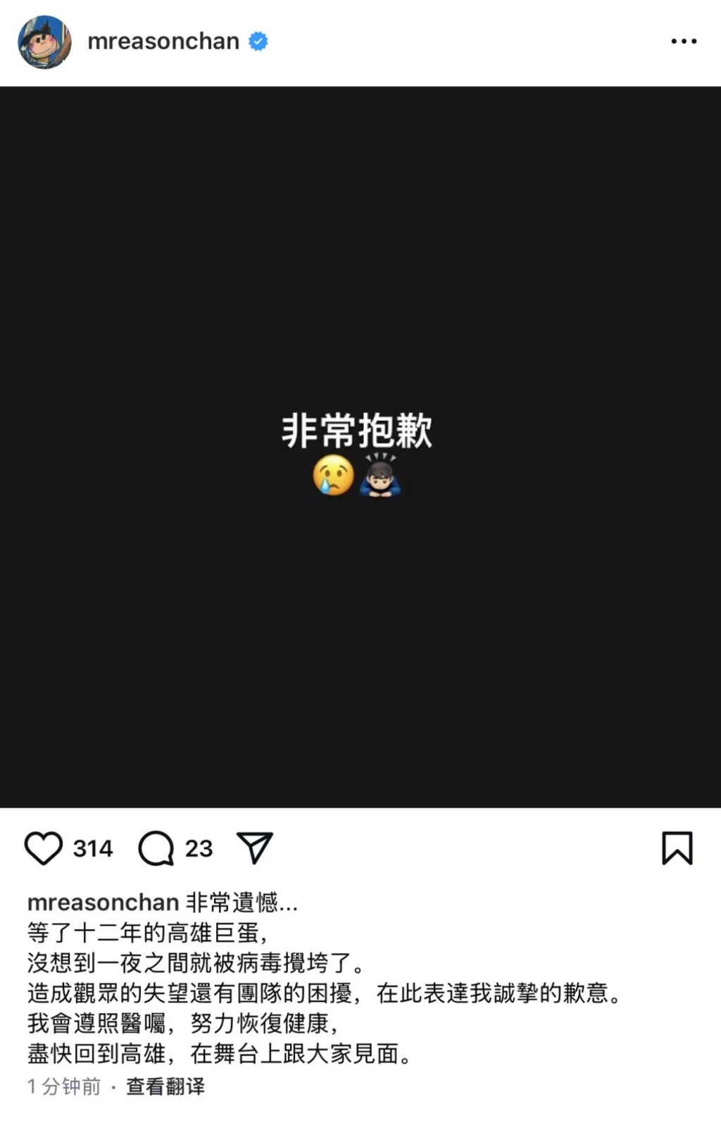 ▲陈奕迅因确诊新冠肺炎而无奈将演唱会延期举行。
