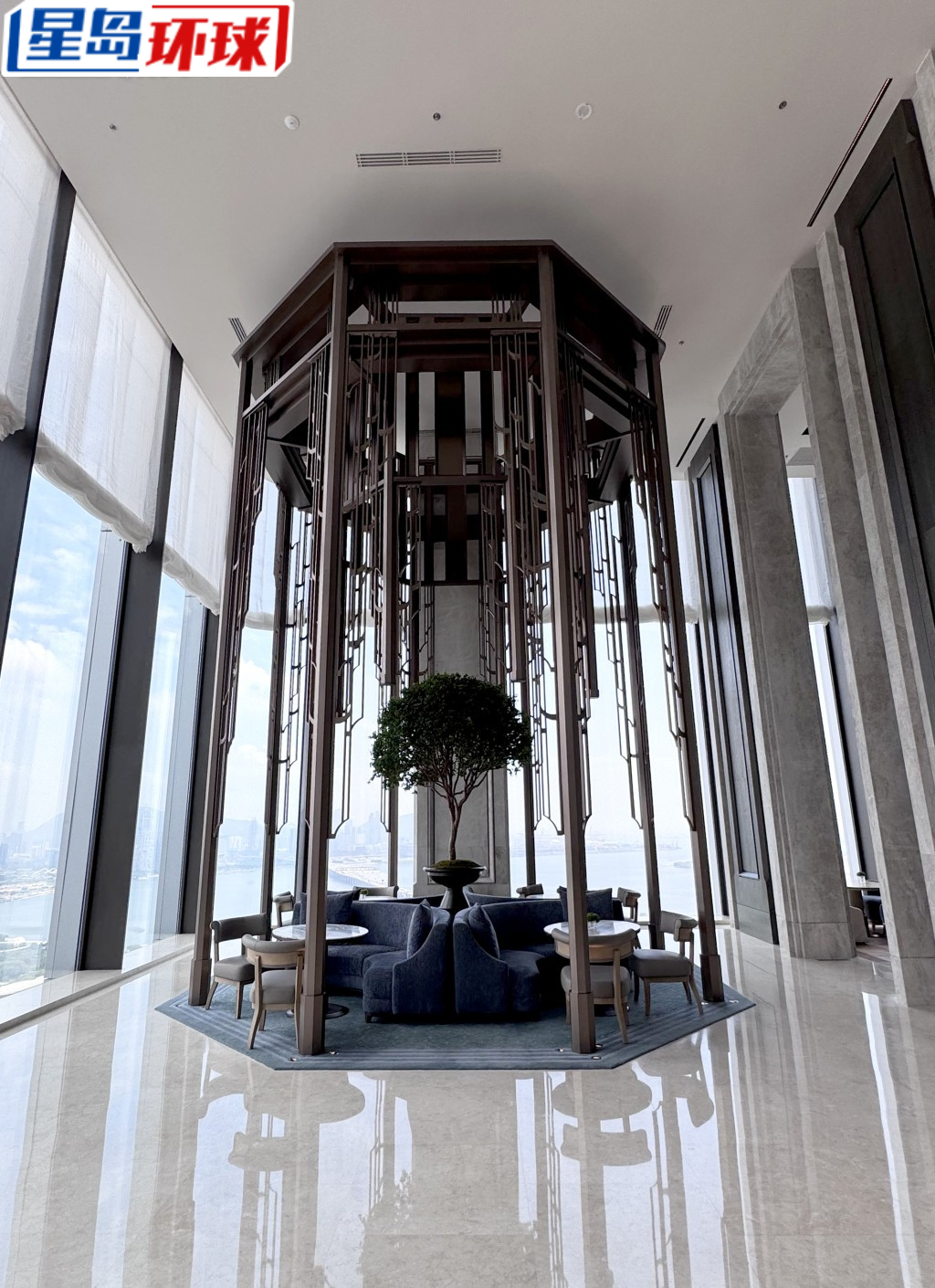 空中大堂特设落地大玻璃,让住客可高高在上俯瞰深圳湾无敌海景与城市天际线,更是黄昏时份欣赏日落美景的好地方。旁边亦有座以黄铜打造的独立青铜亭阁(The Pavilion),Pavilion无论在东方或西方都有着“人与人之间相聚”之意,设计师特意借这结构来表达深圳是个“文化交汇的地标”。而每日日暮时份,St. Regis百年传统“马刀开香槟”入夜仪式,亦会在这里举行。