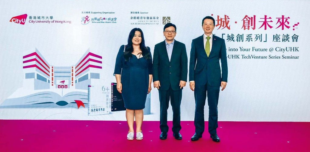 ▲今年5月10日“城.创未来暨‘城创系列’座谈会”开幕典礼上,余皓媛青年发展基金创办人、城大校董会成员余皓媛女士,MH(左);劳工及福利局局长孙玉菡先生,JP(中),以及城大校董会主席魏名成(明德)先生(右)在致欢迎辞及开幕辞后合照,标志活动正式启动。