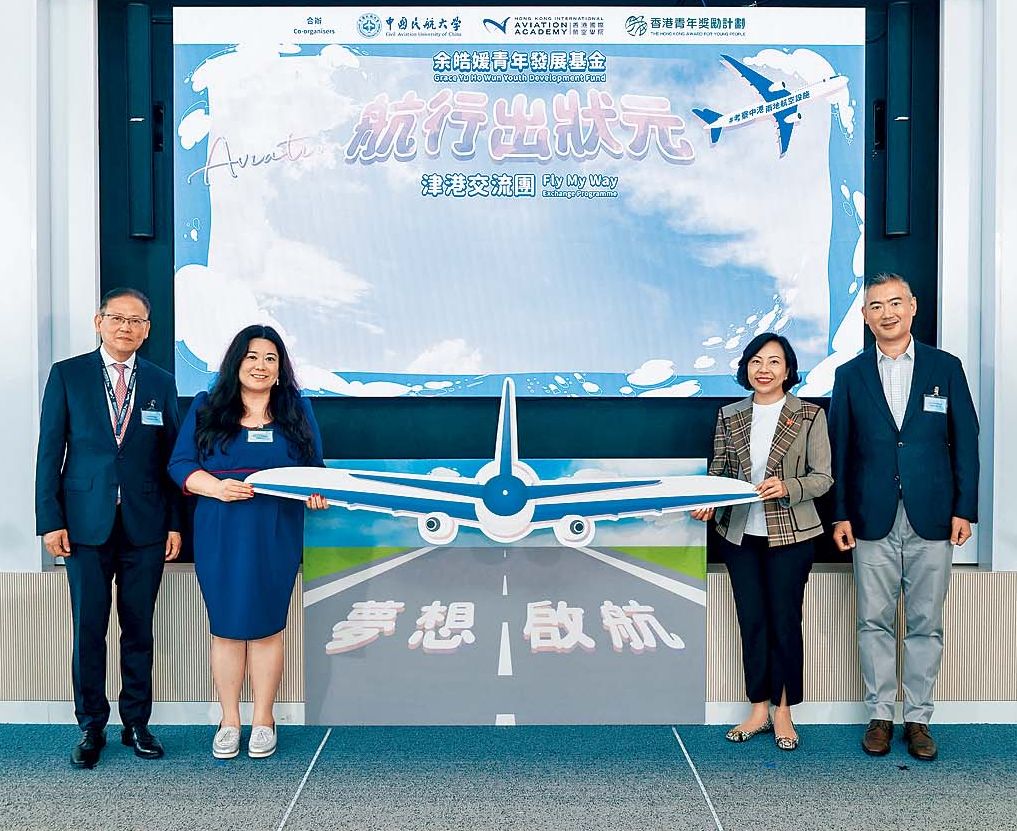 ▲2023年6月,余皓媛青年发展基金再次赞助举办“航行出状元津港交流团2023”,送行礼邀请到民政及青年事务局局长麦美娟女士,SBS, JP(右二)担任主礼嘉宾,连同奖励计划理事会主席郭永亮先生,JP(右一)、“余皓媛青年发展基金”赞助人及奖励计划理事会委员余皓媛女士(左二)和香港国际航空学院校长李天柱先生,SBS(左一),为两地参加者在开展天津之旅前打气。