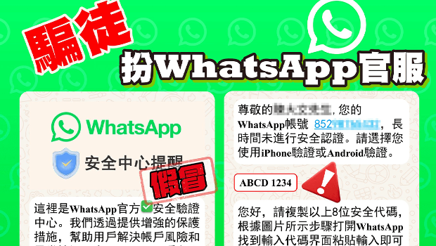 WhatsApp又有新型骗案?! 骗徒手法层出不穷,每日手机都会接收不少不明电话和短讯,警方指骗徒近日又重施故技,假冒“WhatsApp官方安全验证中心”发送钓鱼讯息,声称其帐户长时间未进行安全认证,要求输入一次性“8字代码”进行验证。