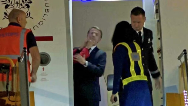 ▲法国总统专机才刚打开舱门,就看到马克龙总统遭到夫人“打脸”,引发各种疯传。(图/美联社)
