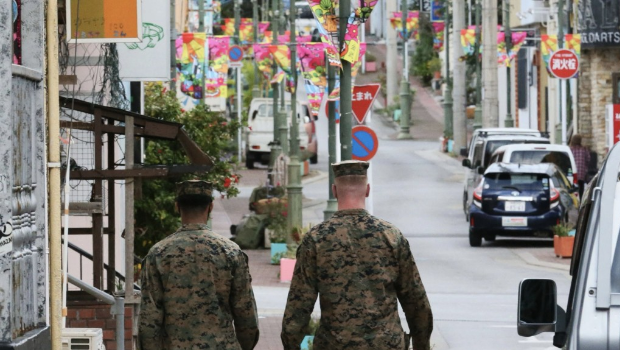 ▲身穿制服的美军在冲绳普天间机场汉森营附近巡逻。 法新社