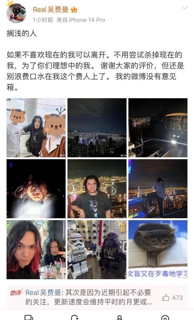 吴费曼日前就于微博以68字作出大反击,他以“搁浅的人”为题,他写道:“如果不喜欢现在的我可以离开。不用尝试杀掉现在的我,为了你们理想中的我。谢谢大家的评价,但还是别浪费口水在我这个废人上了。我的微博没有意见箱。”
