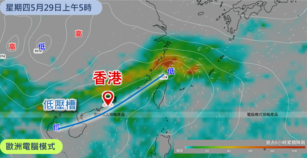 天文台预料,华南将在本星期三及星期四(5月28及29日)迎来一次“龙舟水”降雨过程。一道低压槽会在周三于华中形成。随着低压槽向南移近华南沿岸,该区会转吹偏南风,大气低层水汽增多。同时高空西风槽亦会加深,槽前伴有高空辐散,加强气流抬升,这连结会以新视窗打开。有助强对流发展,届时广东沿岸天气渐转不稳定。预料低压槽会在星期三稍后至星期四横过华南沿岸,并为华南带来骤雨及狂风雷暴。