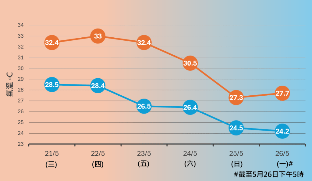 ▲5月21至26日天文台录得的最高及最低气温。