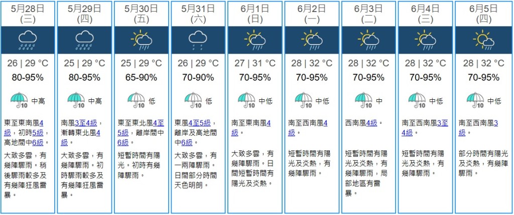 根据天文台九天天气预测,明日起连续九日都有骤雨。本周六端午节气温26至29度,大致多云,有一两阵骤雨。日间部分时间天色明朗。