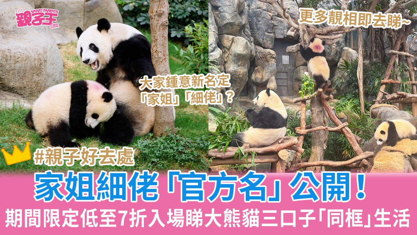 迷倒全香港市民的龙凤胎大熊猫“家姐”、“细佬”,昨日(27日)终于有正式的官方名字喇! “家姐”叫“加加”(JIA JIA)、“细佬”叫“得得”(DE DE),名字从收到35,700多份命名建议中拣选,“加加”寓意加油打气,亦有“家”的元素,家国腾飞、人民幸福;“得得”意指香港事事都“得”,亦有中国人崇尚的美“德”。 海洋公园早前亦安排龙凤胎大熊猫与妈妈盈盈“同框”生活,还有期间限定8折优惠,即睇“加加”、“得得”最新近照!