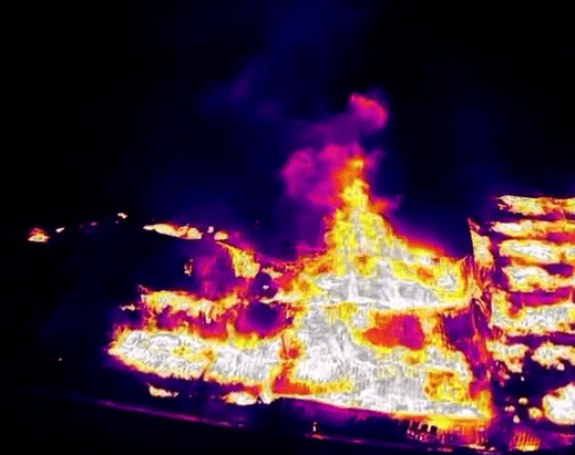消防处公布的航拍片段,除了展示火场真实面积及焚烧情况之外,亦利用热成像技术展示火场内部高温情况。
