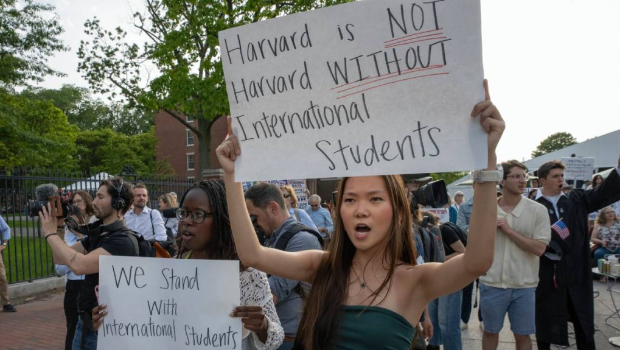报道指,有学生的标语写着“特朗普=叛徒”,另有群众呼喊“属于课堂的人让他们留下来”,他们指的是哈佛大学的国际学生。特朗普政府日前透过撤销哈佛大学的“学生及交换访客登录系统”(SEVIS)认证,取消他们招收外国学生的权利。